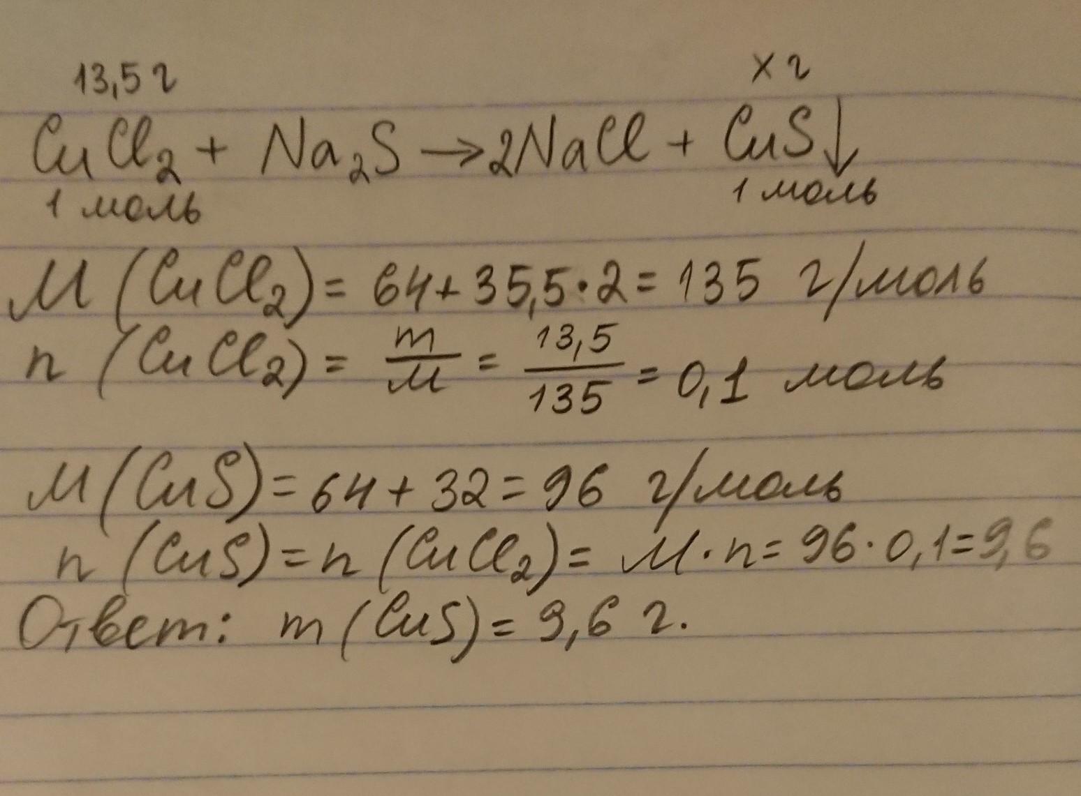 Определите массу осадка (г), полученного при взаимодействии 13.5 грамм хлорида меди(II) с избытком раствора сульфида натрия.