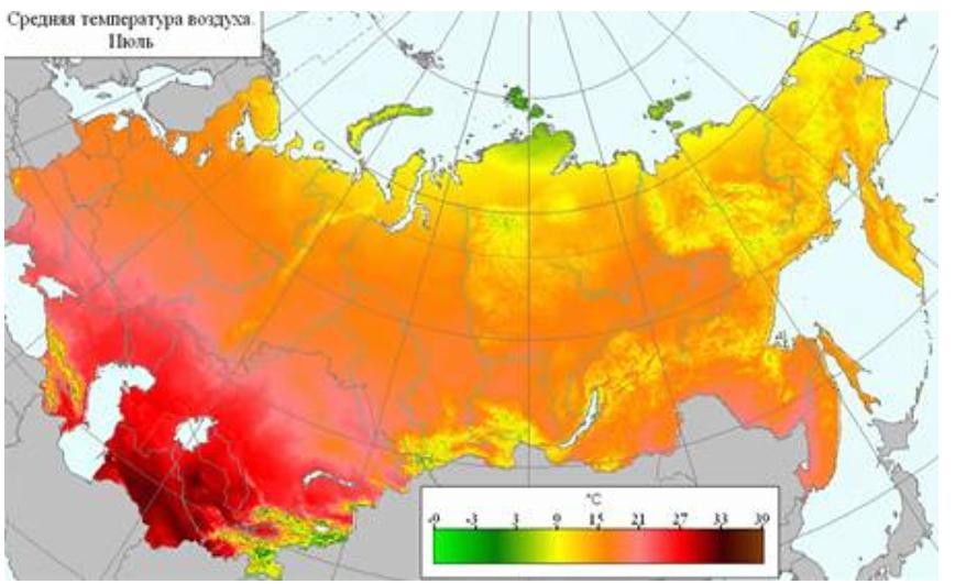 Как видно из карты средних температур июля, которая дана ниже в приложении, температура самого тёплого месяца на территории России уменьшается с юга на север, что связано с уменьшением угла падения солнечных лучей и как следствие уменьшение количества солнечной радиации.