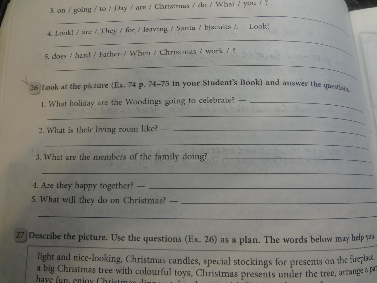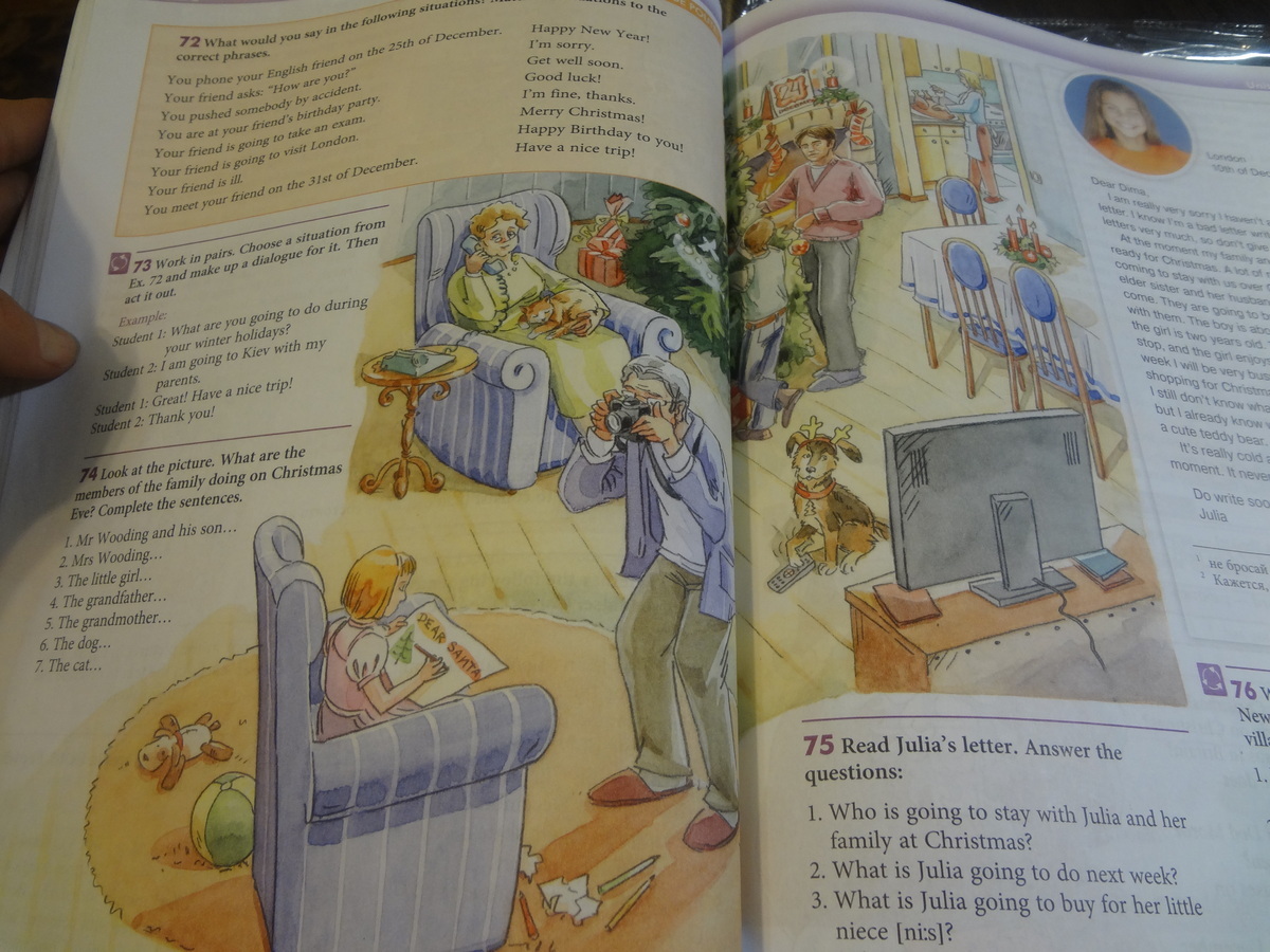 3 Маленькая девочка пишет письмо Санте Клаусу, бабушка говорит по телефону с кошкой. Дедушка фотографирует внучку, отеч\пап с сыном разукрашивают ёлку. Мама готовит курицу и собака смотрит телевизор(там сокрощёно)