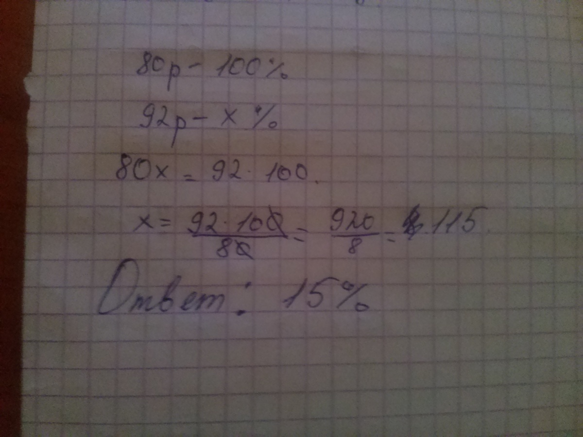 один литр бензина стоил 80 рублей. После повышения цен один литр бензина стал стоить 92 рубля. На сколько процентов повысилась цена бензина?