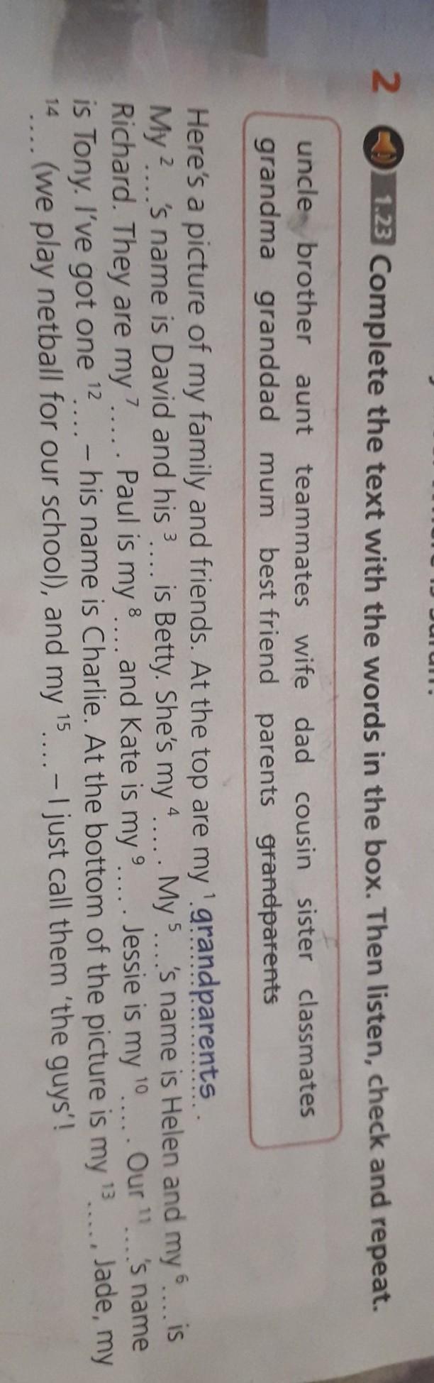 granddad,wife,grandma,mum,dad.parents,brother,sister,aunt,uncle,cousin,best friend,teammetes,classmetes