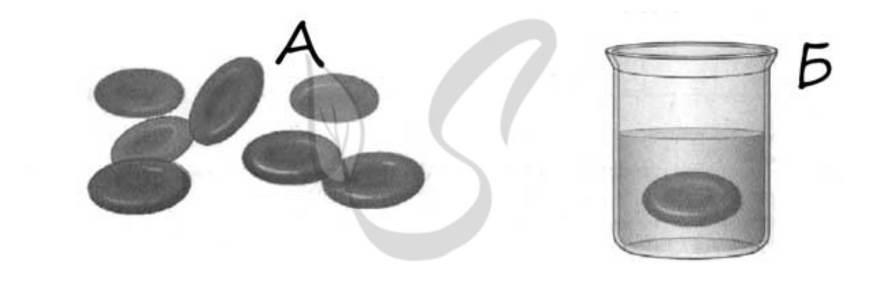 В стеклянный стакан, заполненный раствором поваренной соли, поместили эритроциты. Сравните рисунки нормальных эритроцитов (А) и эритроцита в растворе (Б). Определите по внешнему виду эритроцита концентрацию раствора солей в сосуде