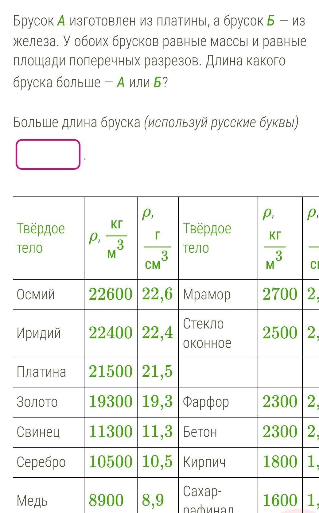 Длина бруска и плотность - это обратно пропорциональные величины. Чем больше плотность, тем меньше длина.