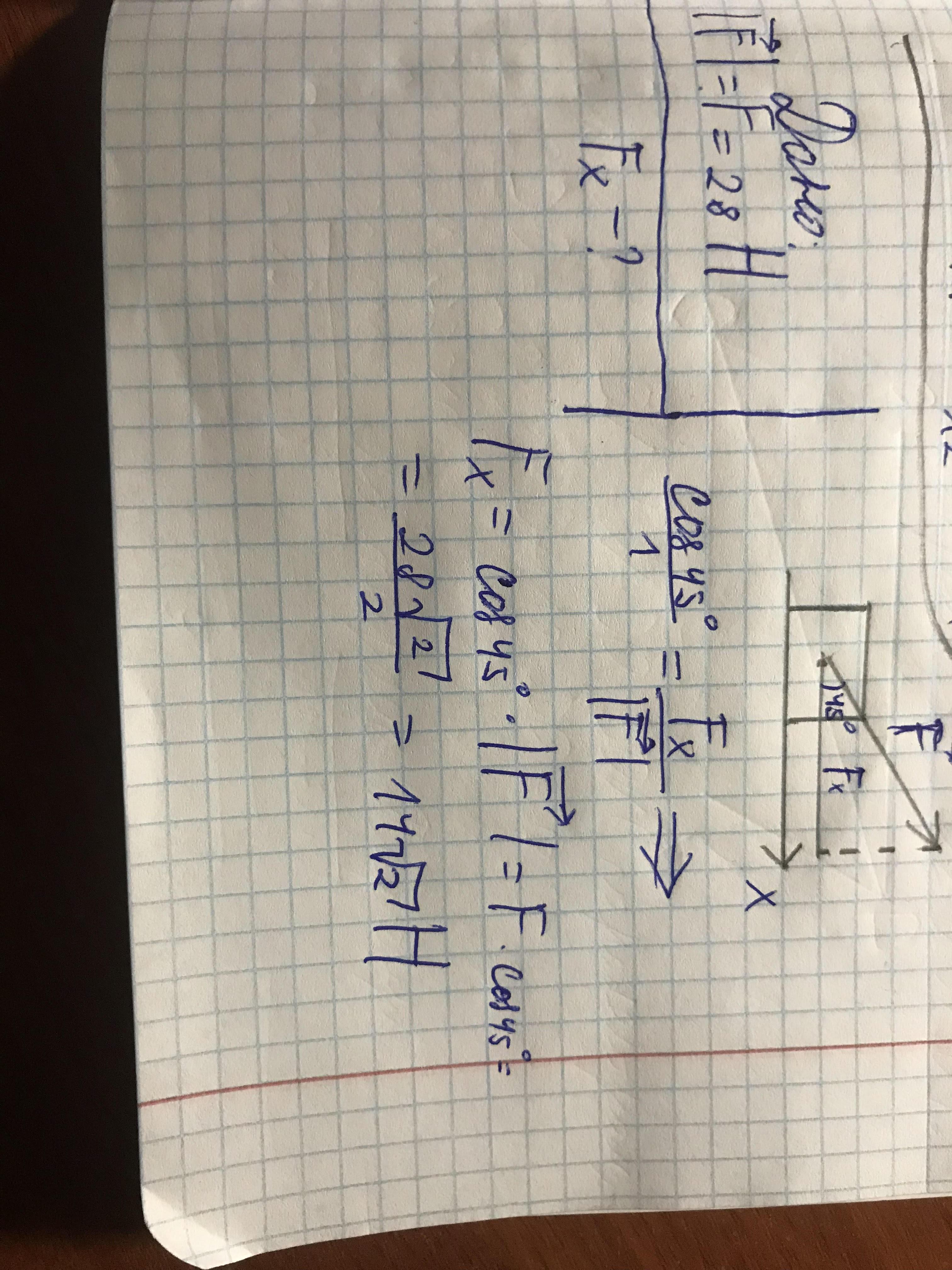 Дитячі санчата тягнуть за мотузку під кутом 45° до землі. Обчисли горизонтальну проекцію сили тяги, якщо дитячі санчата тягнуть із силою 28 N.