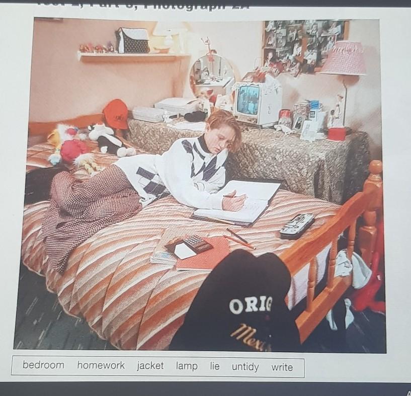 In this photo you can see a child. Her room is untidy. She is writing her homework on her bed. Her bed in her bedroom.Jacket is on her bed.Lamp is standing on the table next to the TV.Walls are pink.Floor is grey.She have a mirror in her room.There are a board with her photos.She have two lamps in her room.There are on her shelf a lamp and a little bag.She is wearing a skirt and sweater. Her hair is blond and short.She have two plush toys on her bed.She is doing her homework with calculator.She have some workbooks on her bed too.Her pencilcase is white and black.Her lamp is pink.Her second lamp is white.