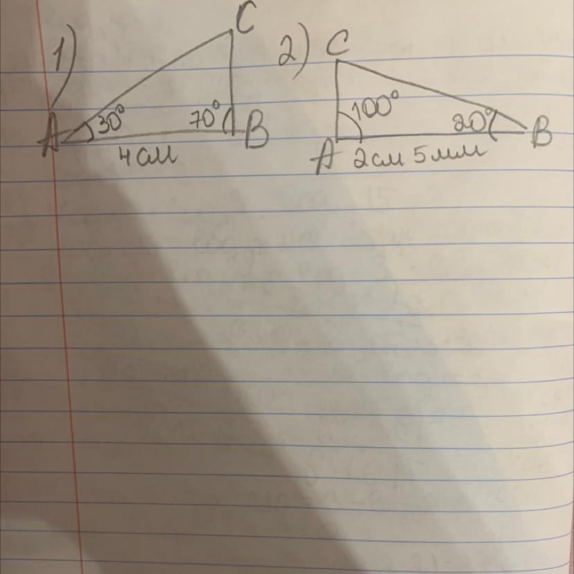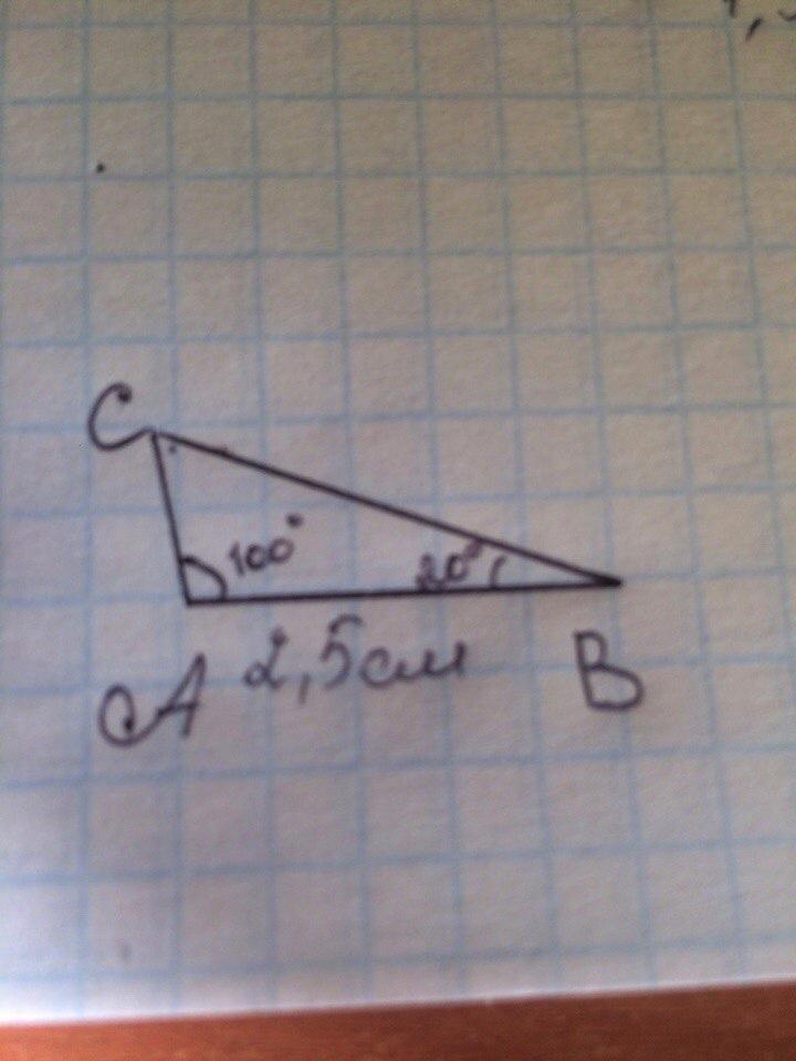 сторона AB равна 2 см 5 мм, а углы CAB и CBA соответственно равны 100 градусам и 20 градусам
