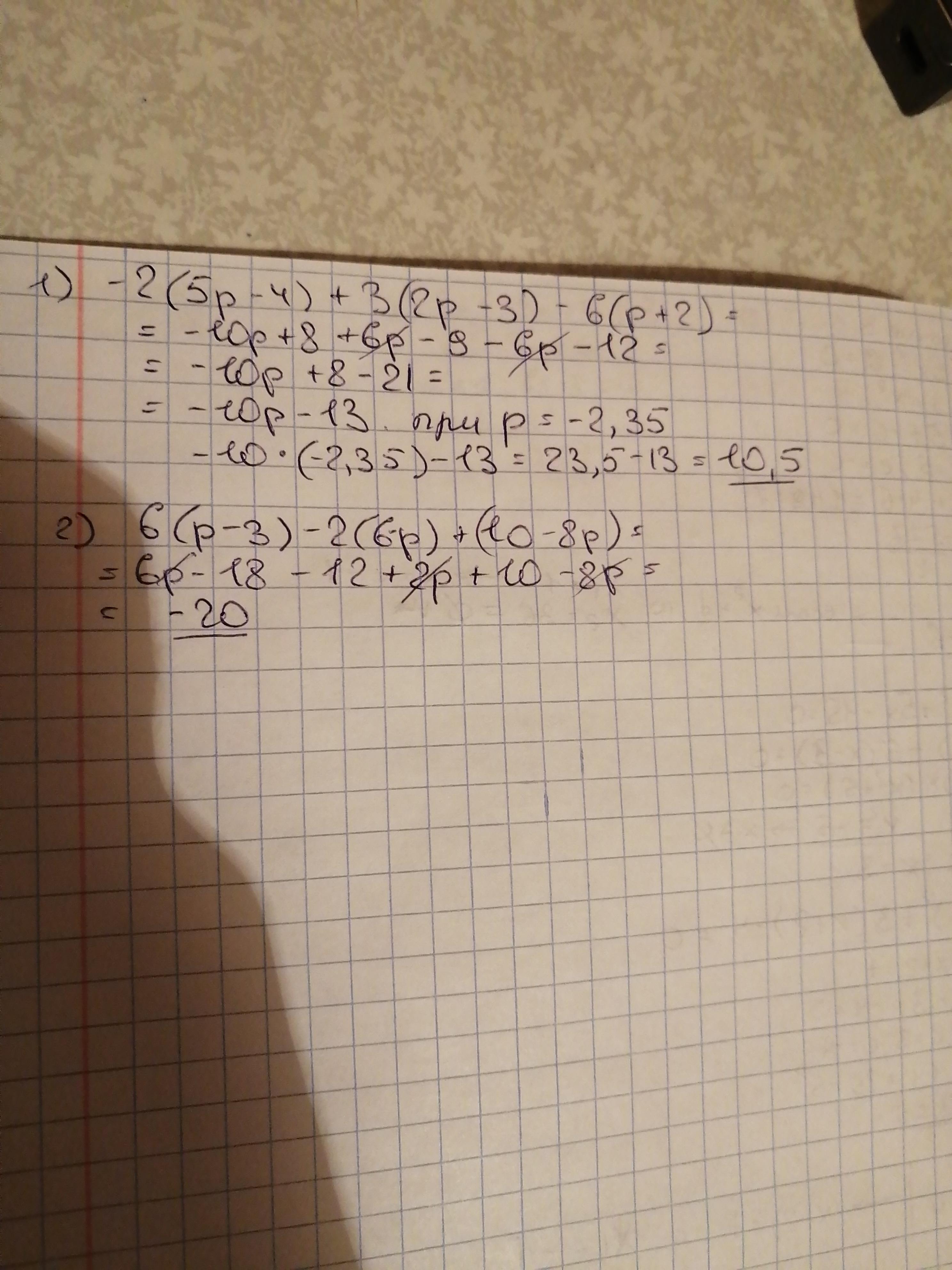 2) 6(p-3)-2(6-p)+(10-8p)=6р-18-12+2р+10-8р=0р-20=-20.