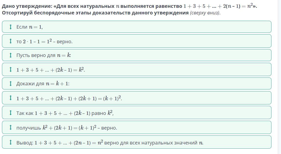 Дано утверждение: «Для всех натуральных n выполняется равенство 1 + 3 + 5 + … + 2(n – 1) = n2». Отсортируй беспорядочные этапы доказательств данного утвержден. Срочноо даю 12 баллов!!!!