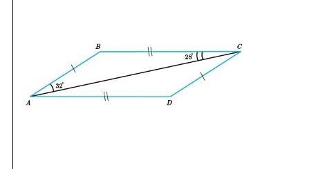 Дан четырёхугольник ABCD, у которого AB = DC, BC = AD, ∠BAC = 32°, ∠BCA = 28°.