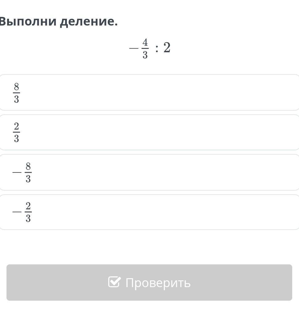 -4/3 : 2 = -4/3 : 2/1 = - дробная черта сверху 4 * 1 снизу 3 *2 = -2/3