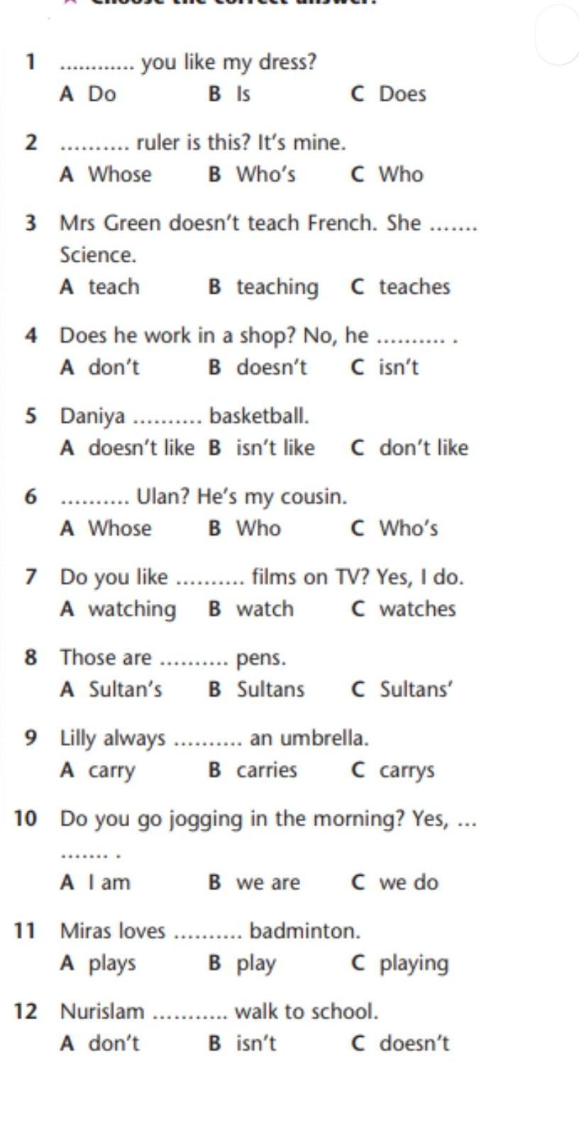 1. A, 2. A, 3.C, 4. B, 5. A, 6. C, 7.B, 8. A, 9. B, 20. C, 11. C, 12. C