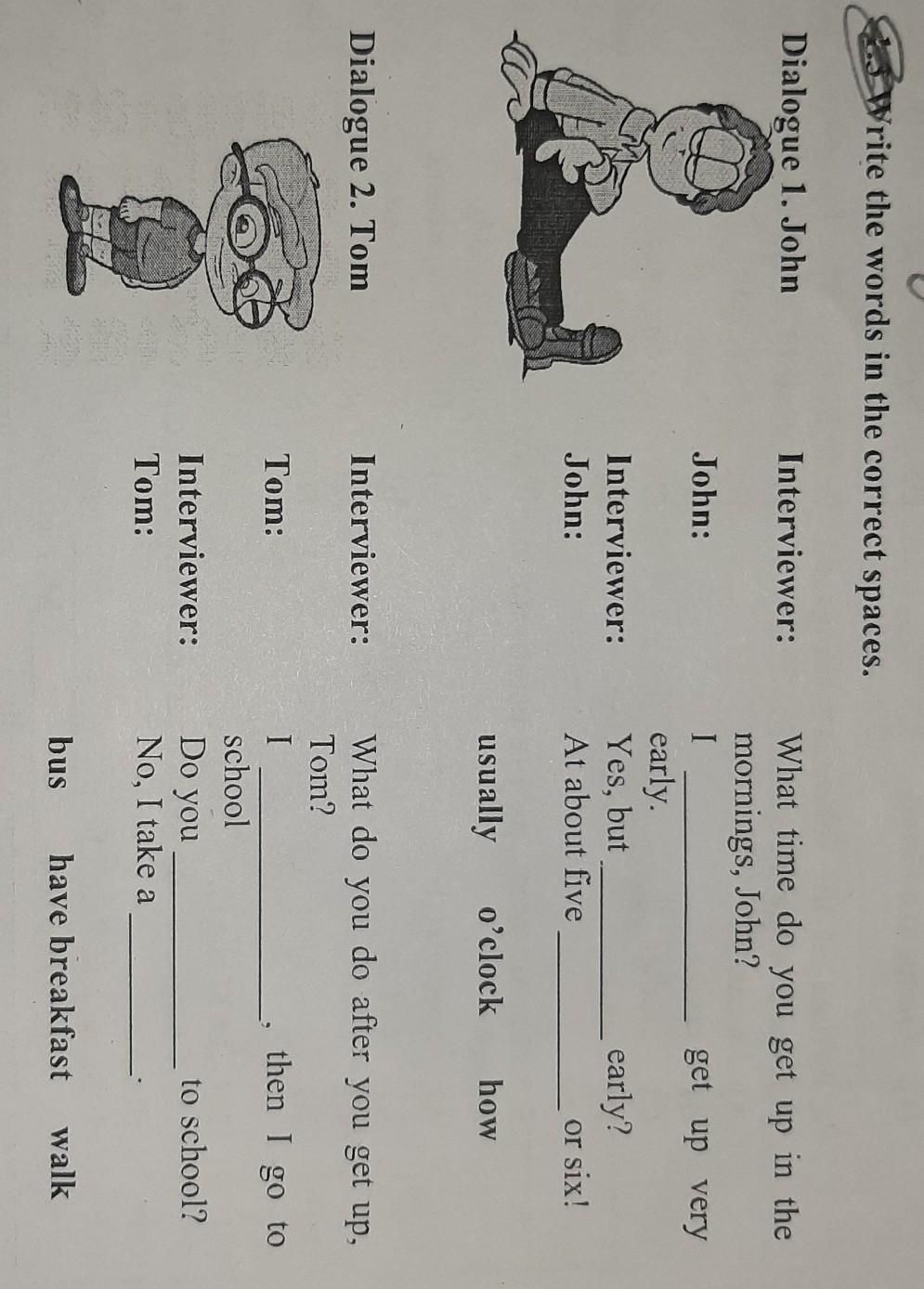 2) walk, have breakfast, bus