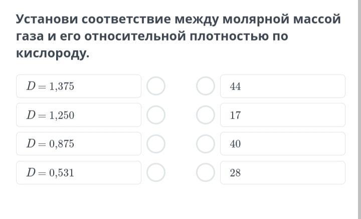 Установи соответствие между молярной массой газа и его относительной плотностью по кислороду.