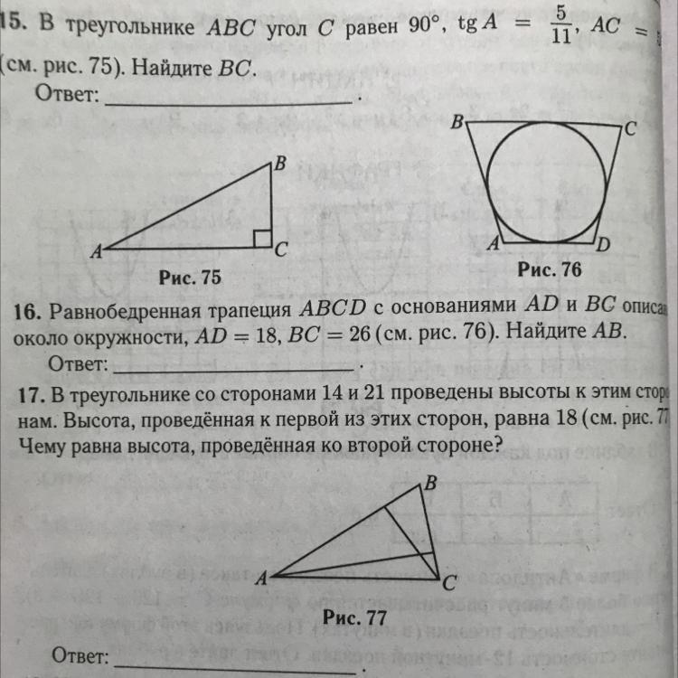 16 и 17 задание. Равнобедренная трапеция ABCD с основаниями АD и BC описана около окружности AD=18,!BC=26 найди АВ