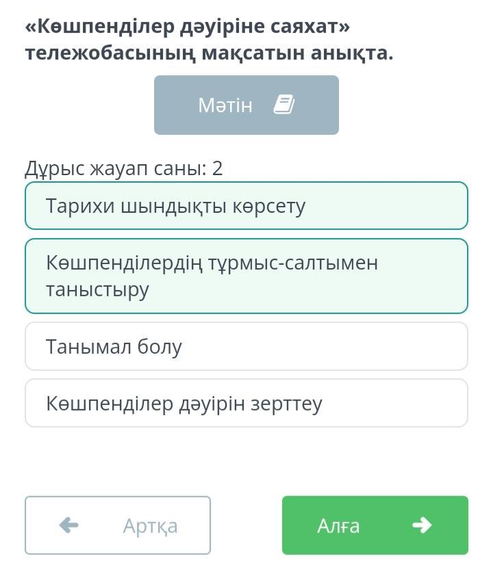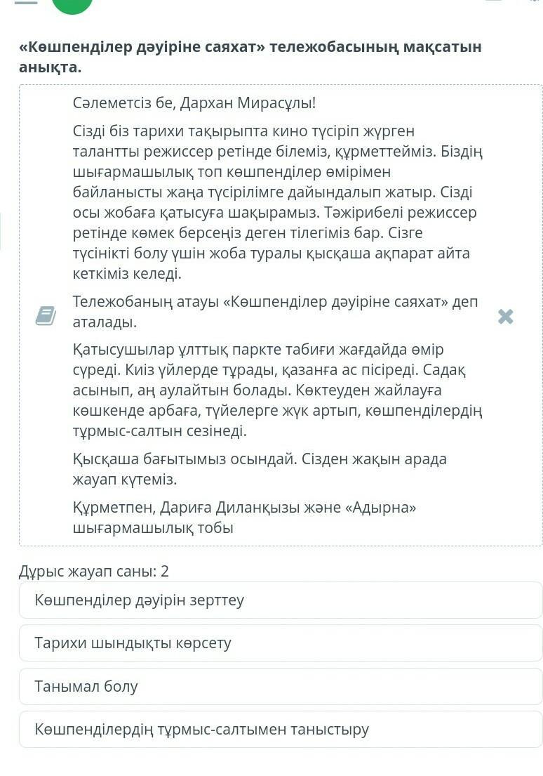 Көшпенділер дәуіріне саяхат тележобасының мақсаты анықта.Дұрыс жауап саны :2 танымал болу,Көшпенділердің тұрмыс-салтымен таныстыру , Тарихи шындықты көрсету ,Көшпенділер дәуірін зерттеу.