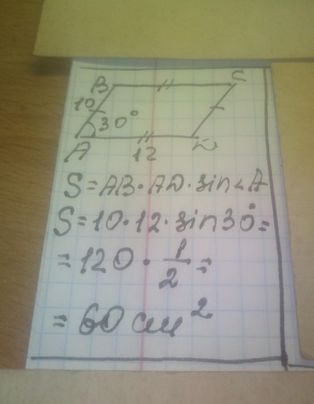 Найдите площадь параллелограмма, если две его стороны равны 10 см и 12 см, а угол