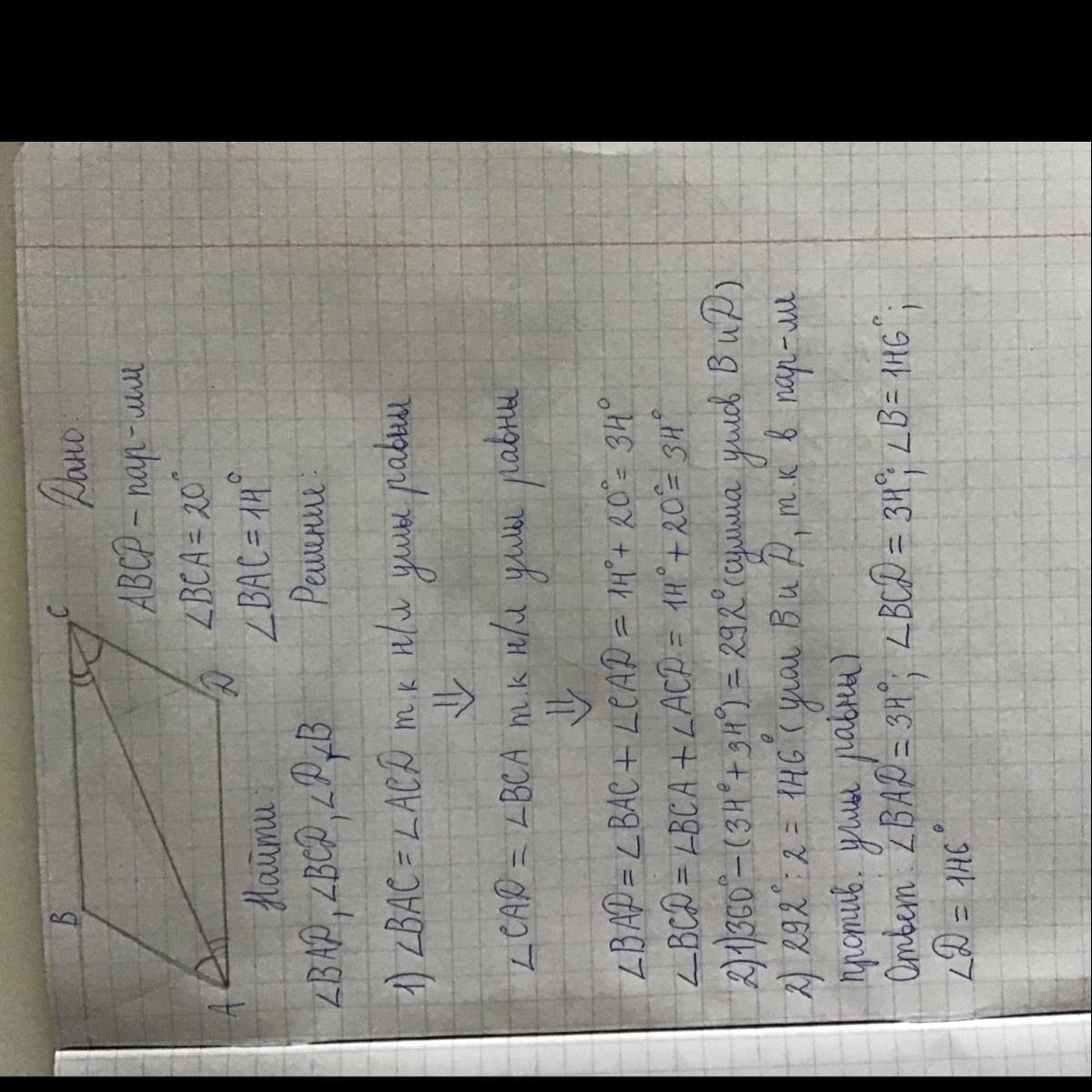 Дано ABCD параллелограмм Угол BCA равен 20 градусам угол BAC равен 14 градусов. Найти угол BAD, BCD, B, D.
