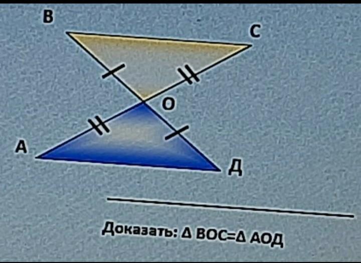 треугольники ВОС и АОD равны по двум сторонам и углу между ними