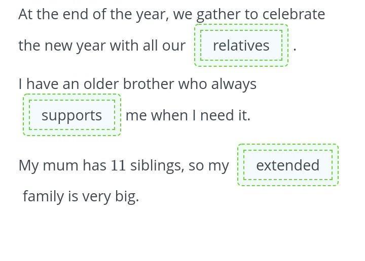 At the end of the year, we gather to celebrate the new year with all our . I have an older brother who always me when I need it. My mum has 11 siblings, so my family is very big.