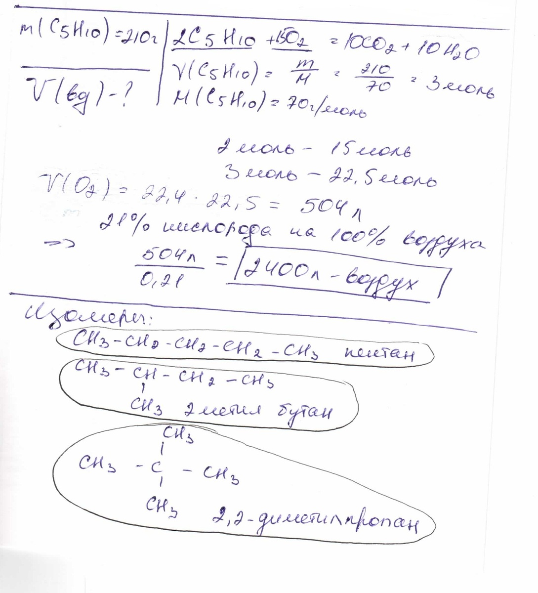 какой объем воздуха(н.у.) потребуется для полного сгорания 210 г пентена? Составить структурные формулы изомеров.