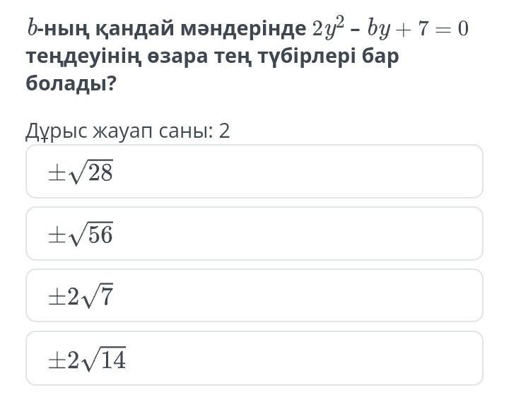 При каких значениях b уравнение 2y2- by + 7 = 0 будет иметь взаимно равные корни?