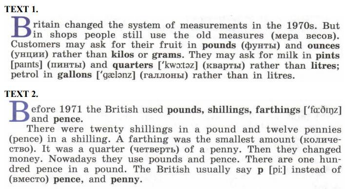 ТЕКСТ 1. Великобритания изменила систему измерений в 1970-х годах. Но люди в магазинах Din по-прежнему используют старые меры (Mepa BecoB). Клиенты могут просить фрукты в фунтах (byTh) и унциях (YHILMH), а не в килограммах или граммах. Они могут просить молоко в пинтах [красках] (IHHTL) и четвертях ["kwaxtaz] (KBaprTHI), а не в литрах; бензин в галлонах ['gælanz] (raJIOHLI), а не в литрах. ТЕКСТ 2. До 1971 года британцы использовали фунты , шиллинги, фартинги ['faðinz] и пенсы. Было двадцать шиллингов в фунте и двенадцать пенсов (пенсов) в шиллинге. Наименьшая сумма (KOAHYE- CTBO) - это фартинг. Это четверть (4eTBepTb) пенни Затем они поменяли деньги. В настоящее время они используют фунты и пенсы. В фунте одна сотня пенсов. Британцы обычно говорят p [pi:] вместо (BMECTO) пенсов и пенни.