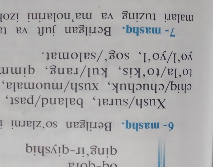 toʻla/toʻkis, kul/rang, qimmat/baho, ish/yoqmas, dori/vor,
