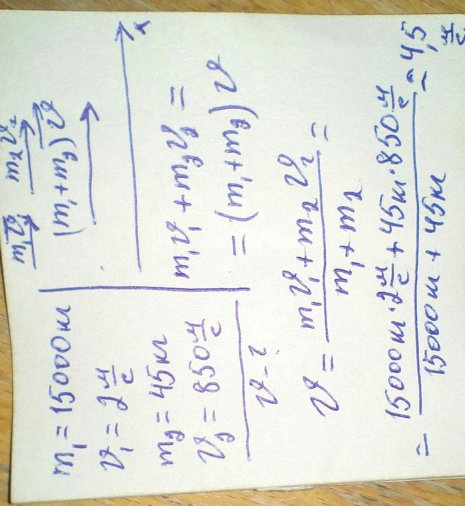 v=( 15т*2 - 45*850) / ( 15000+45)=−0,54835493519