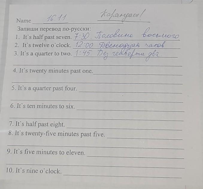 Ответ: 4) один час двадцать минут, 5) четыре часа пятнадцать минут, 6) пять часов десять минут, 7) половина девятого, 8) пять часов двадцать пять минут, 9) пять минут одиннадцатого, 10) девять часов