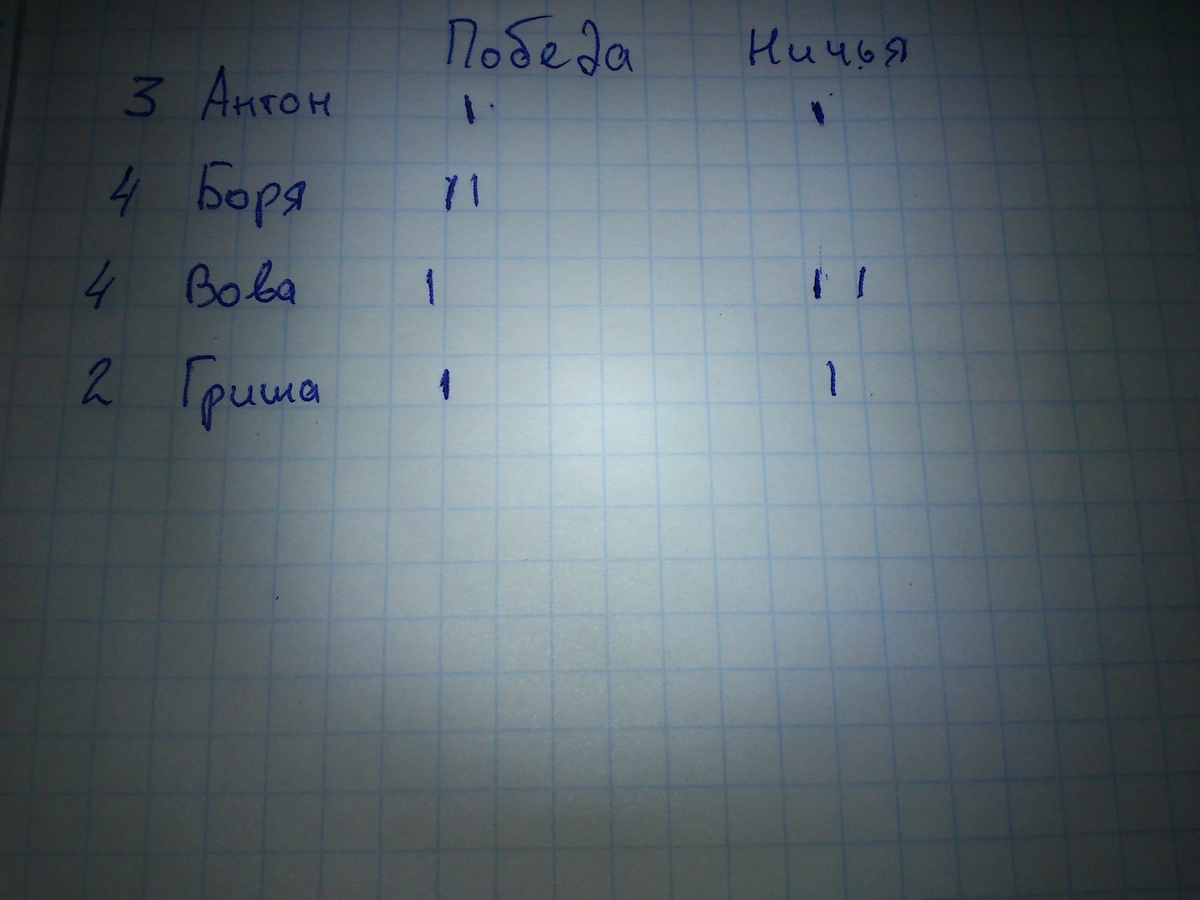 Боря Антон Вова и Гриша играли в шахматы Антон выиграл у бори проиграл грише сыграл вничью с володей Вова проиграл Боре и сыграл вничью с гришей борис проиграл вове но выиграл у гриши