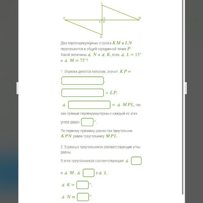 1. Отрезки делятся пополам, значит, KP=PM, NP=LP.