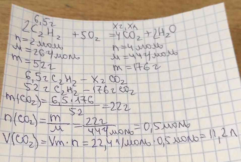 Вычислите массу и объём (н.у.) углекислого газа, который образуется при полном сгорании 6,5 г ацетилена.