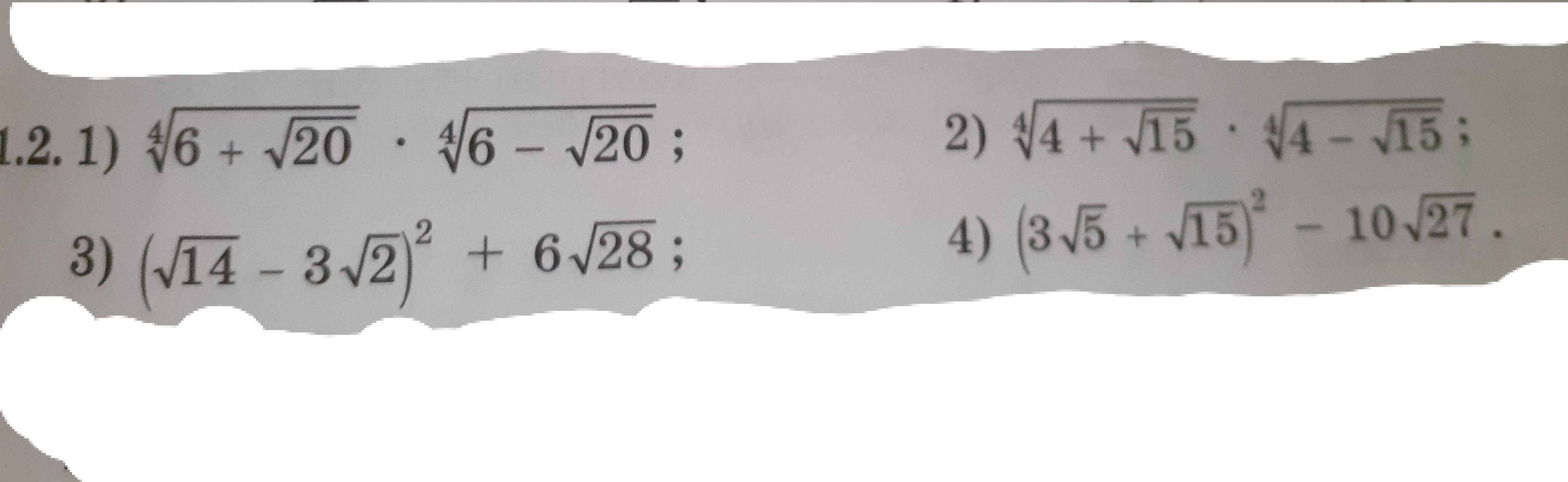 \sqrt[4]{6+\sqrt{20} } *\sqrt[4]{6-\sqrt{20} }=\sqrt[4]{(6+\sqrt{20} )(6-\sqrt{20} )}=\\=\sqrt[4]{6^2-(\sqrt{20} )^2}=\sqrt[4]{36-20}=\sqrt[4]{16}=2\\