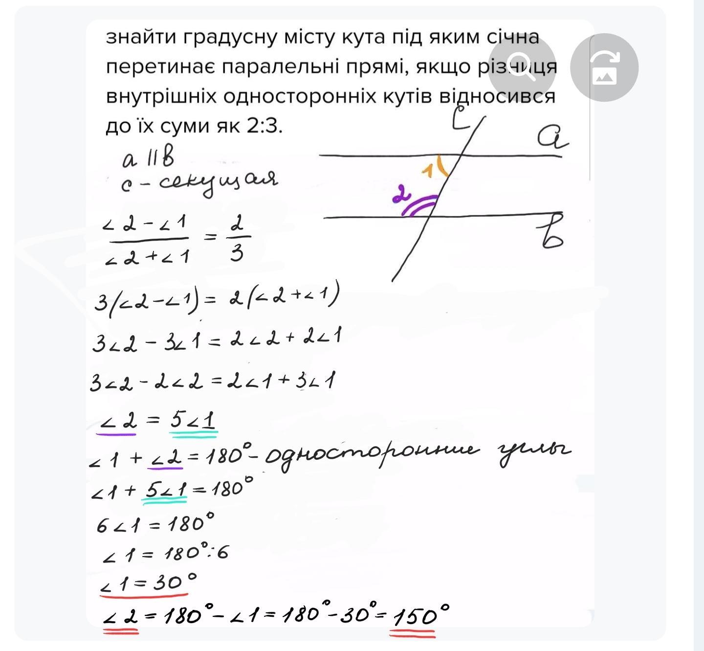 знайти градусну місту кута під яким січна перетинає паралельні прямі, якщо різниця внутрішніх односторонніх кутів відносився до їх суми як 2:3.