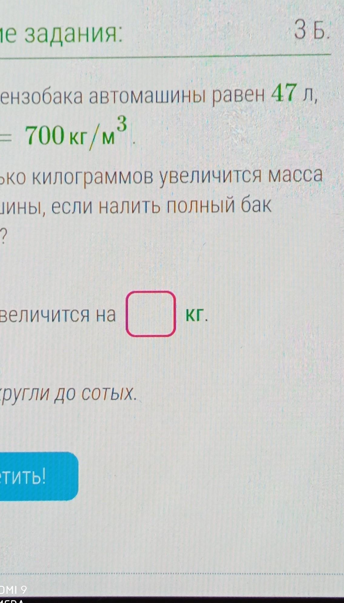 Объём бензобака автомашины равен 47 л, ρбенз.=700кг/м3.