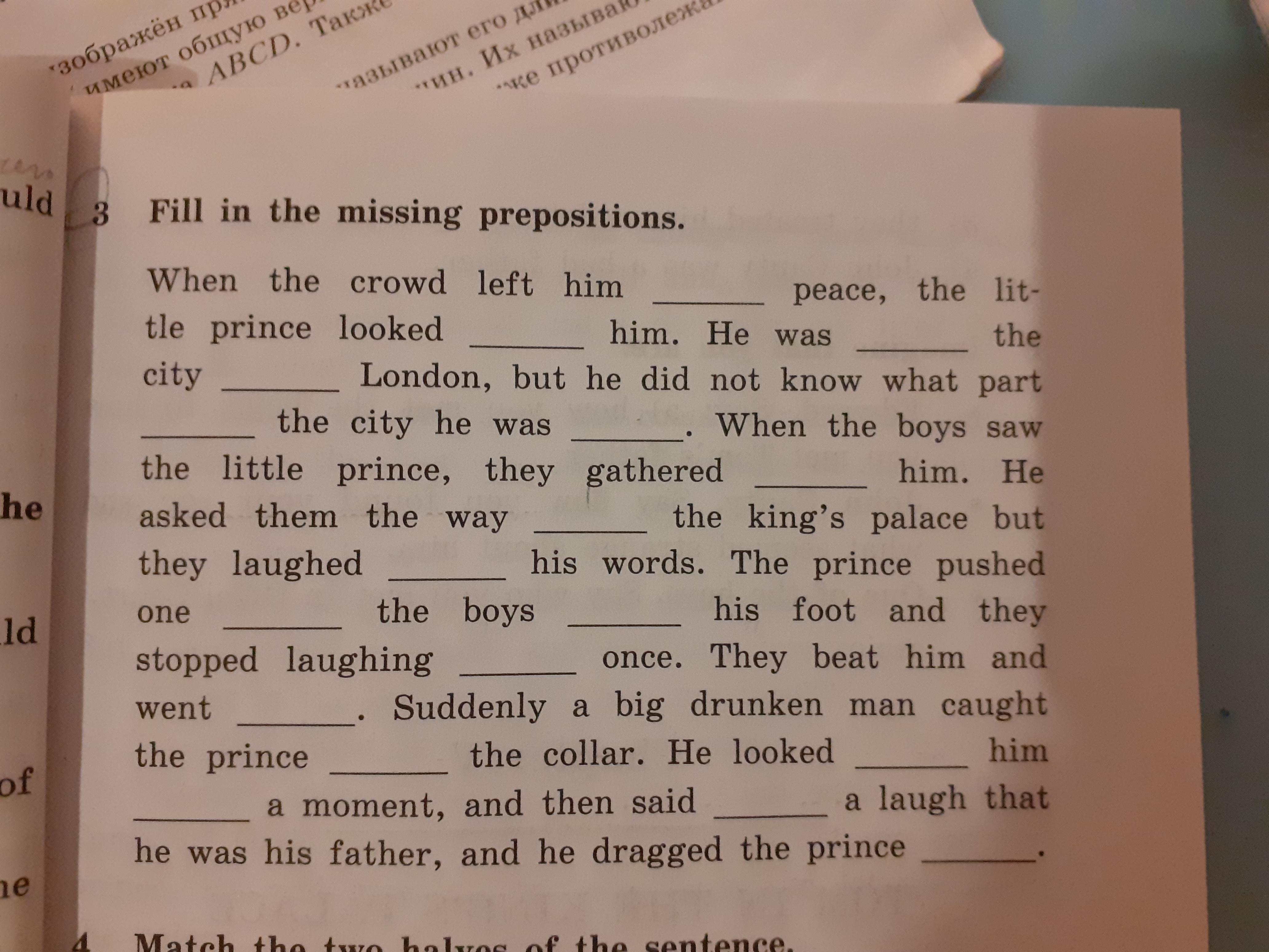 When the crowd left him in peace, the little prince looked around him. He was in the city London, but he did not know what part of the city he was. When the boys saw the little prince, they gathered around him. He asked them the way to the kings palace but they laughed at his words. The prince pushed one of the boys with his foot and they stooped laughing at once. They beat him and went away. Suddenly a big drunken man caught the prince by the collar. He looked at him for a moment, and then said with a laugh that he was his father, and he dragged the prince away.