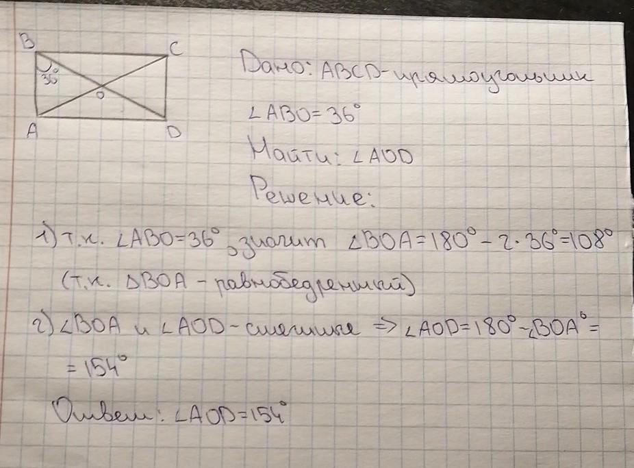Диагонали прямоугольника ABCD пересекаются в точке O ,угол ABO=36 градусов.Найдите угол AOD.
