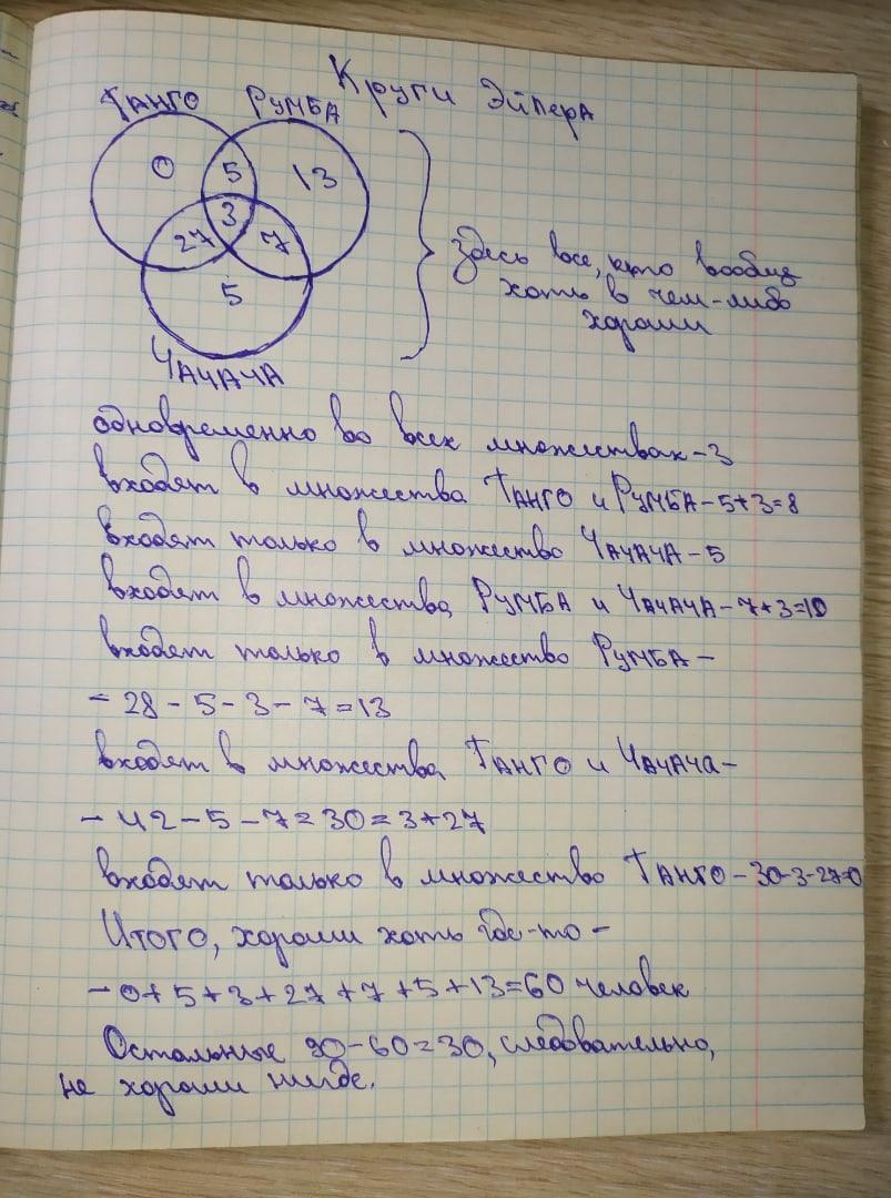 Из 90 конкурсантов, прибывших на танцевальный конкурс 30 человек хорошо танцуют танец ТАНГО. 28 человек хорошо танцуют танец РУМБА и 42 человека хорошо танцуют танец ЧА-ЧА-ЧА. Но 8 человек из всех конкурсантов одновременно хорошо владеют танцем Румба и Танго. Танцем Румба и Ча-Ча-Ча одновременно владеют 10 человек. 5 человек хорошо умеют танцевать только танец Ча-Ча-Ча и 3 человека одновременно сильны во всех 3-х танцах. Сколько конкурсантов не владеют хорошо ни одним танцем?