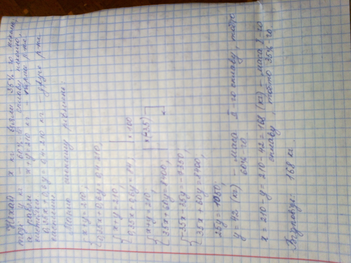 ПООООМОГИТЕ!!!!!два сплава,из которых первый содержит 35% никеля,а второй содержит 60% никеля,сплавили друг с другом,получив 210 кг сплава,содержащего 40% никеля. сколько килограммов составляла масса первого сплава?