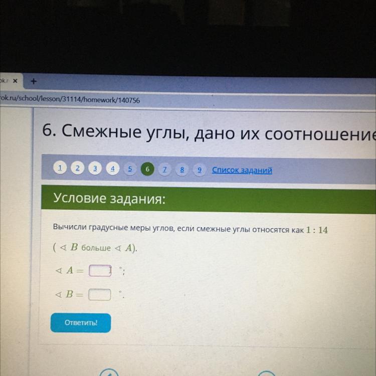 Вычисли градусные меры углов, если смежные углы относятся как 1: 14