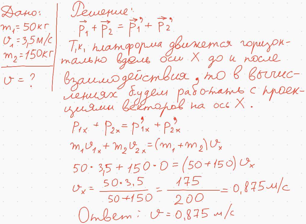платформу массой 50 кг движется со скоростью 3,5 м\с на нее вертикально насыпают песок массой 150 кг. Определите скорость, с которой станет двигаться платформа. С рисунком пж