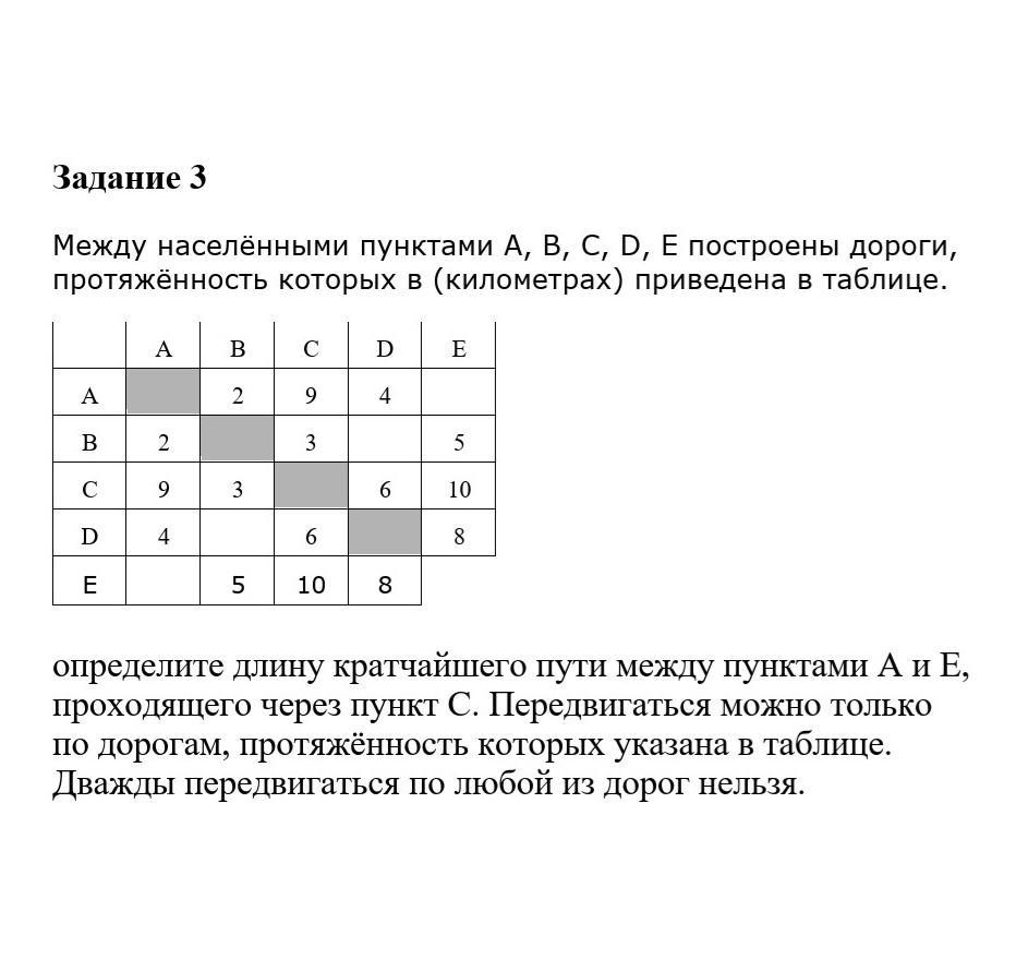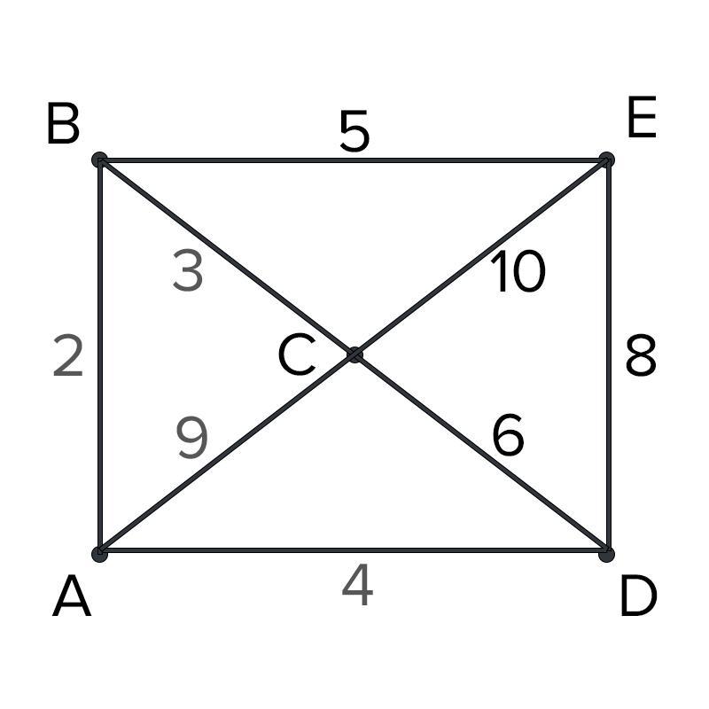 - Пусть C-E (длина 10) есть в маршруте. Тогда для более короткого маршрута длина остальных отрезков пути должна быть не больше 4, но наименьшие длины других отрезков 2 и 3, либо A-D длины 4. Не подходит, C-E отбрасываем - по нему путь короче 15 не проходит.