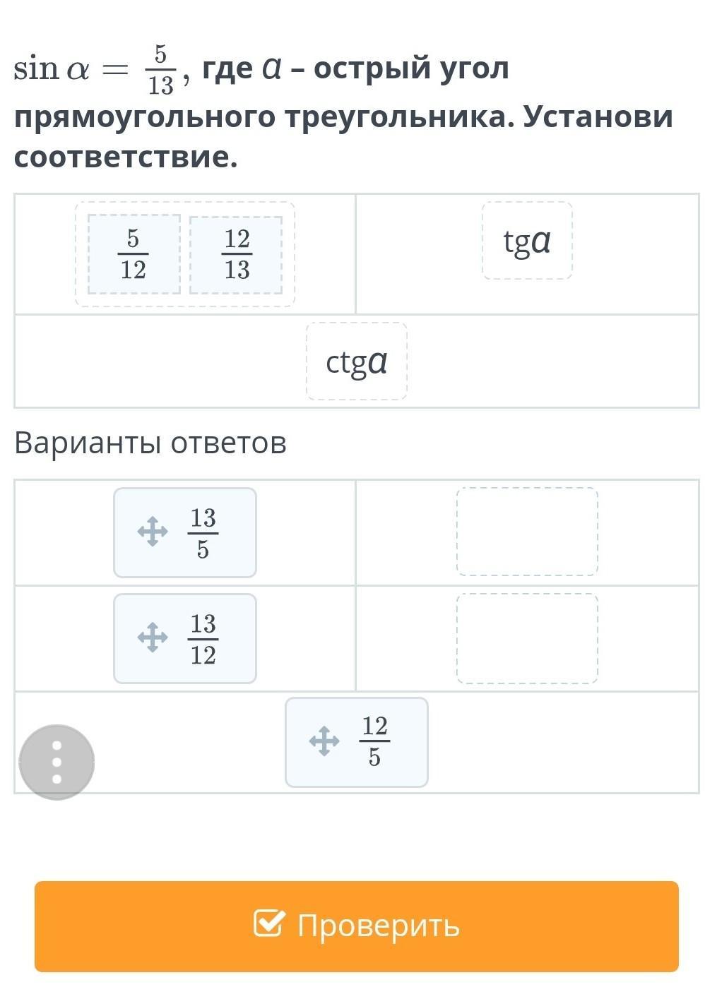 так как известно, то угол находится во второй координатной четверти, то косинус, тангенс и котангенс угла будут отрицательными. Чтобы найти косинус угла, воспользуемся осн. тригон. тождеством. cos^2(a)=1-sin^(a)=1-25/169=144/169. cos(a)= - 12/13. tg(a)=sina/cosa=5/13 / (-12/13)=-5/12; ctga=1/tga=-12/5