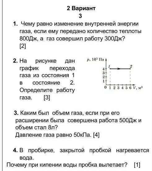 1. Чему равно изменение внутренней энергии газа, если ему передано количество теплоты 800Дж, а газ совершил работу 300Дж? [2]
