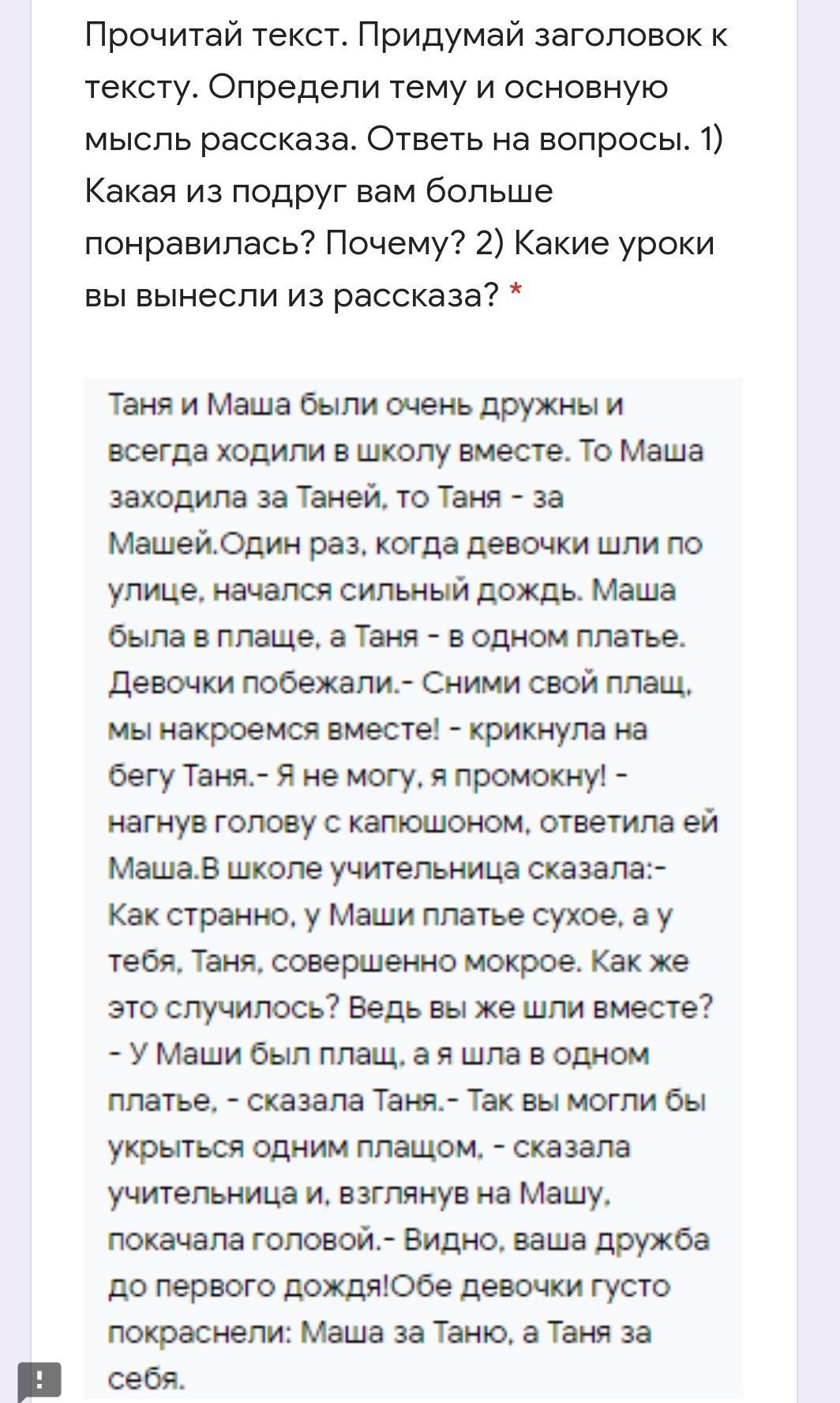 Прочитай текст. Придумай заголовок к тексту. Определи тему и основную мысль рассказа. Ответь на вопросы. 1) Какая из подруг вам больше понравилась? Почему? 2) Какие уроки вы вынесли из рассказа? *