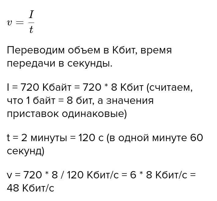 По каналу связи передаётся информация объемом I = 720 Кбайт, время передачи t = 2 минуты. Определить пропускную способность v – ?