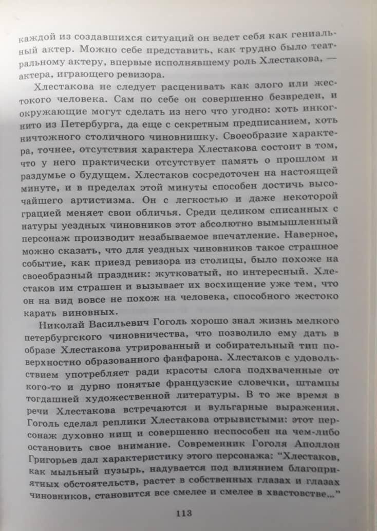 Также можно сказать, что этот человек просто оказался в нужное время в нужном месте. Сам по себе он хитрый, но довольно глупый, хотя в какой-то мере, этими словами можно описать всех действующих лиц данной пьесы. На протяжении всего повествования Хлестаков пытается обхитрить чиновников города, в то время как чиновники пытаются всячески ему угодить. Когда он понимает, что его принимают не за того, кем он является, он начинает пользоваться своим положением. Так как Хлестаков «пустейший» человек, ему легко удается вжиться в роль не только ревизора, но и любого другого персонажа, что позволяет ему продолжать вести свой праздный образ жизни за счет других людей. И чем дольше Хлестаков находится в данном образе, тем больше он врет, больше себе позволяет. В какой-то момент он сам начинает верить в свою ложь и считать, что ему все дозволено. Это проявляется в эпизоде, когда он рассказывает про дружбу с Пушкиным, хотя на самом деле с ним даже незнаком. Но, несмотря на свою любовь ко лжи и вседозволенности, Хлестаков боится наказания. Уезжая из города, его совершенно не мучила совесть за все содеянное, но он боялся наказания за свой долг хозяину гостиницы.