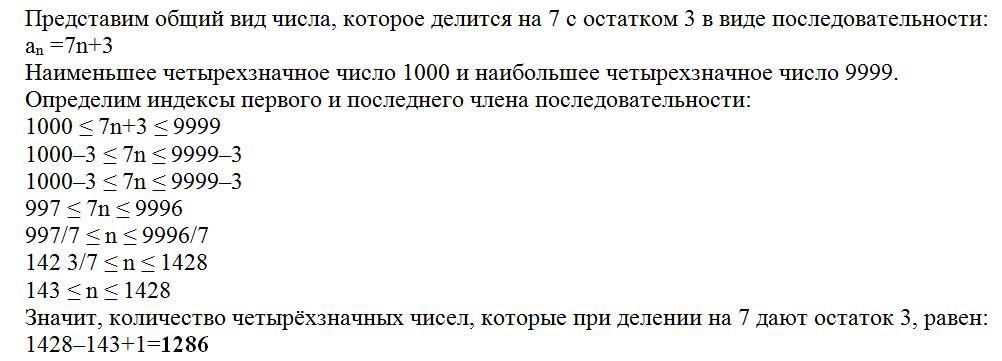 существует 1286 четырёхзначных чисел которые при делении на 7 дают остаток 3