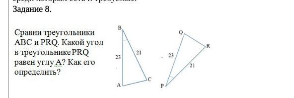 Помогите пожалуйста Сравните треугольники ABC и PRQ.Какой угол в треугольнике PRQ равен углу А? как его определить