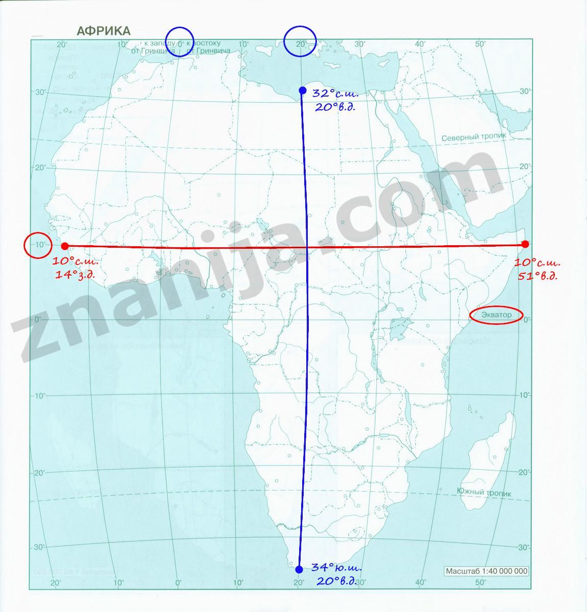 1. Определяем крайние точки материка по заданному меридиану (параллели).